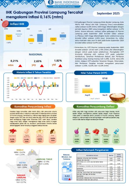 BANDAR LAMPUNG GS – Badan Pusat Statistik mencatat Indeks Harga Konsumen (IHK) Provinsi Lampung pada September 2025 mengalami inflasi sebesar 0,16% (mtm), berbalik dari kondisi Agustus 2025 yang mengalami deflasi 1,47% (mtm). Angka ini lebih rendah dibanding inflasi nasional yang mencapai 0,21% (mtm).